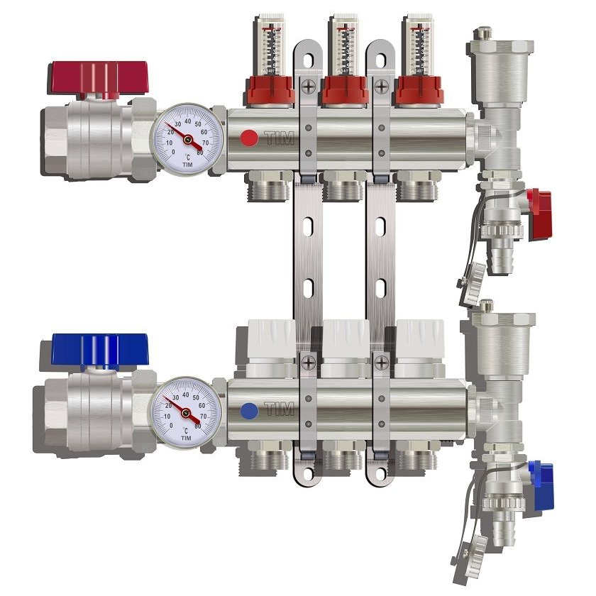 KA003 / Коллекторная группа на 3 выхода, расходомер, воздухоотводчик, сливной кран, торцевой кран, термометр, TIM