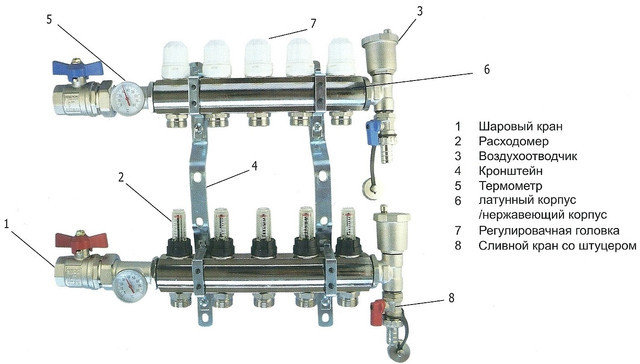 На подающем коллекторе расположены расходомеры с возможностью фиксировать положение, а на обратном коллекторе ― термостатические вентили, с декоративной белой накладкой, сняв которую можно подключить сервомотор и любую другую автоматику управления.