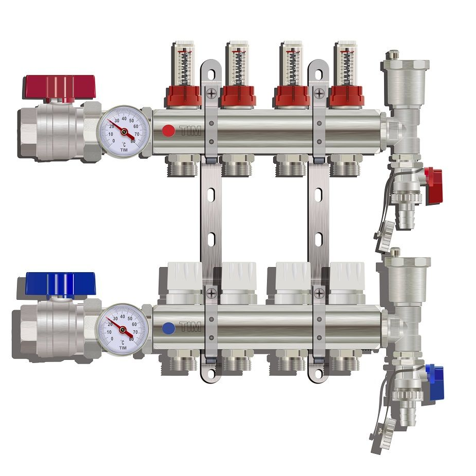 Коллекторные группы TIM® произведены на Европейском оборудовании и обладают высочайшим качеством и надежностью. Коллектор выполнен литьем под давлением из высококачественной латуни CW617N имеет внутренние боковые резьбы 1 дюйм, выводы под контура обеспеченны переходами на ЕВРОКОНУС резьбой 3/4.