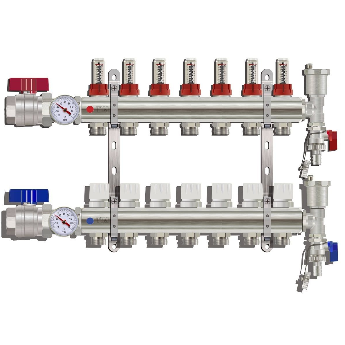 KA007 / Коллекторная группа на 7 выходов, расходомер, воздухоотводчик, сливной кран, торцевой кран, термометр, TIM